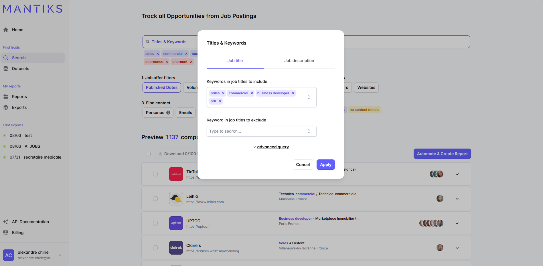 Mantiks ira automatiquement chercher les différents titre de poste (head of sales, chief sales officer, ...) pour trouver la bonne personne.