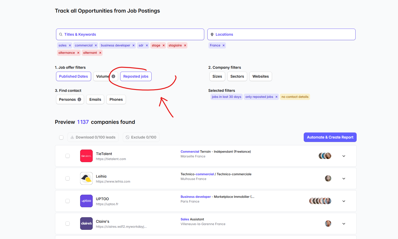 Exemple : on cible ci-dessous les entreprises qui recherchent des commerciaux (Sales), en excluant les stages et alternances.