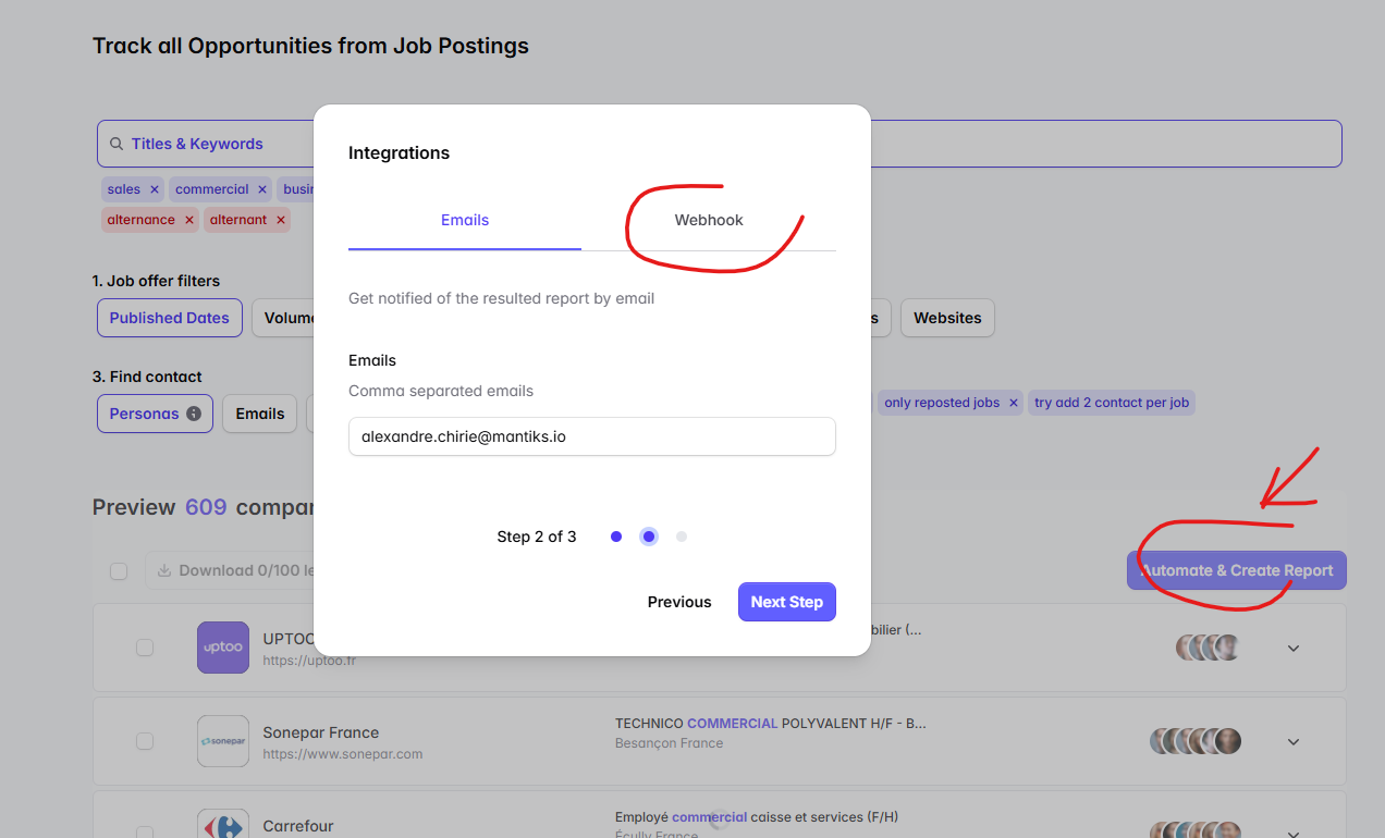 Mantiks s’occupe de cette étape cruciale pour vous en enrichissant automatiquement chaque offre republiée avec les coordonnées des bons contacts :